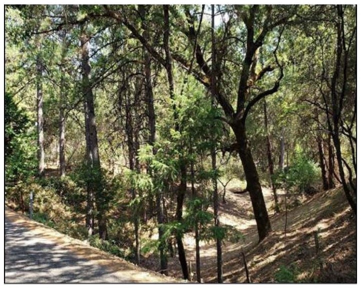 Rocks can be good landscape features. These trees are limbed up, following "continuous canopy option" with leaf litter kept to 3 inches or less. Larger trees could be limbed up further for more wildfire safety.